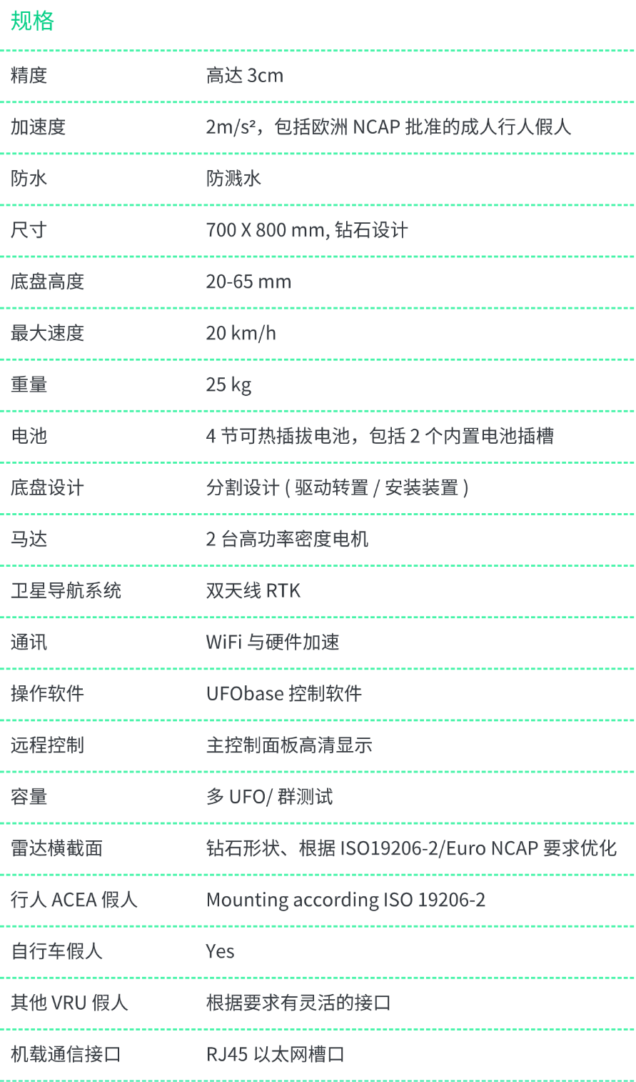 电动 UFO 目标载体可以由操作人员远程控制,并可与车辆或者其他测试机器人同步以执行各种自主测试动作。UFO¹ 的稳定性和高性能特质,使汽车制造商能够以最高的精度和可重复性对最新的碰撞试验